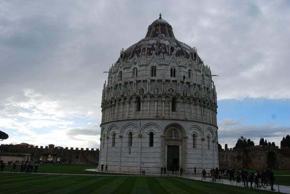 · Le Baptistère : édifice circulaire de 110 m de circonférence et coiffé d’un dôme de 55 m de haut, c’est le plus grand baptistère d’Italie. Il fut construit entre le XIIe et le XIVe siècle : par conséquent, si les deux premiers niveaux sont de style roman, les arcades sont gothiques. L’intérieur est réputé pour son acoustique et pour la chaire décorée par Nicola Pisano en 1260.