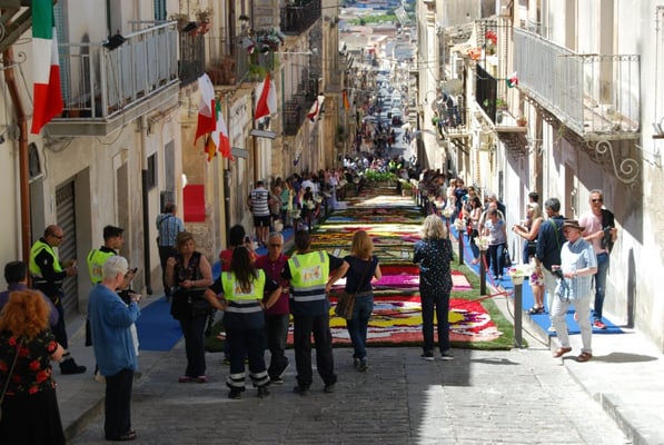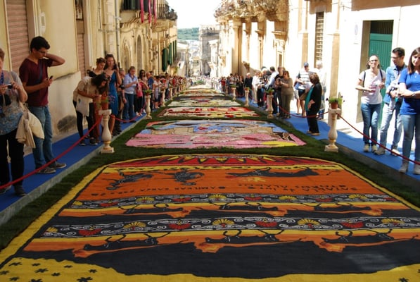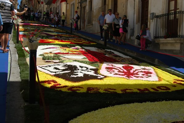 Nous nous installons pour la nuit à Noto et en fait… nous l’ignorions, il y a ce week end la fête «Infiorata» : Pour saluer le retour du printemps les habitants de Noto ont pris l’habitude depuis une vingtaine d’années de tapisser la Via Nicolaci de fleurs en formant des dessins très colorés… Du coup nous resterons jusqu’à dimanche soir…