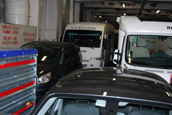 Impressionnants les garages à véhicules ensuite prise de possession de notre cabine puis balade sur le pont afin de vivre le départ de Gênes…