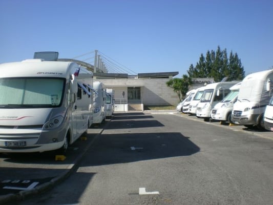 2 emplacements, juste avant la borne de services, le long du mur blanc du stade de foot, sont réservés aux véhicules légers.
