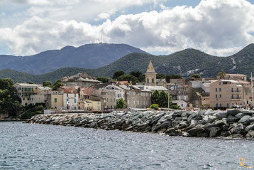 Profitez de la vue sur le golfe : d’un côté la montagne du Cap Corse et de l’autre le désert des Agriates, en face de la ville.