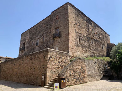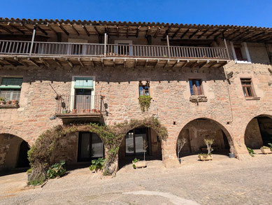 À quelques mètres de la Plaza Mayor se trouve le Château de Santa Pau, une grande maison rectangulaire avec une grande cour intérieure et une tour carrée.