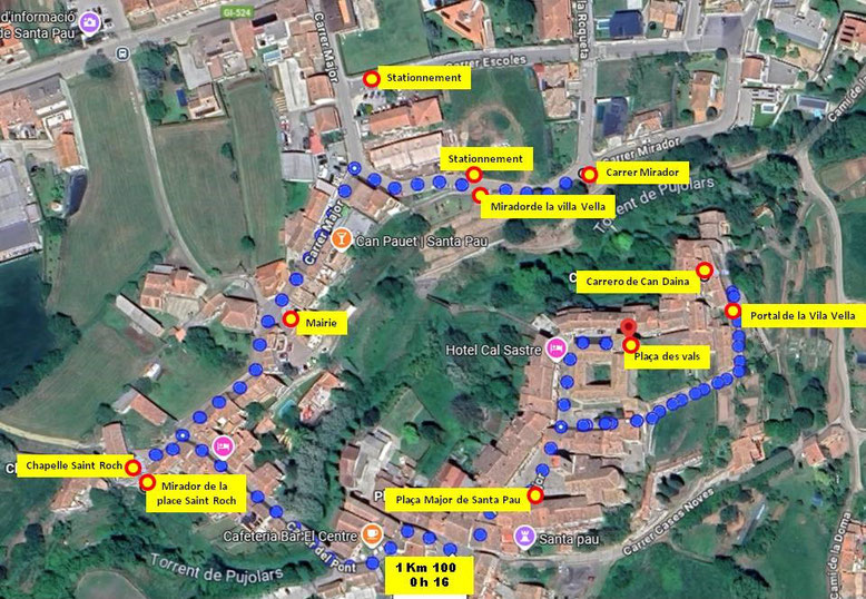 De cette place, vous aurez une vue fantastique sur une rangée de maisons en pierre qui bordent la petite colline sur laquelle se trouve l’ancienne enceinte fortifiée, plusieurs sections du mur et, en arrière-plan, le clocher de l’église de Santa Pau, pendant que vous dégusterez un verre sur la terrasse du bar Can Pauet.