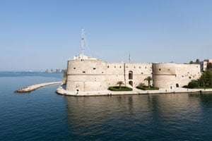 «La ville entre deux mers», c’est ainsi qu’on appelle Tarente, située sur une langue de terre qui sépare la haute mer « Mare Grande », de la rade, « Mare Piccolo ». Le canal artificiel qui les unie est franchi par le célèbre pont tournant qui mène au cœur ancien de la ville Taranto Vecchia, avec sa Cathédrale de San Cataldo, le Castello Argonese, appelé aussi Castel Sant’Angelo, et d’autre témoignages de ses origines.