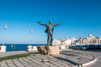 Polignano est connue dans le monde entier pour trois choses. Tout d'abord, comme le laisse entendre l'indice fourni plus haut, la plongée depuis les falaises. Ces dernières années, la ville a accueilli la compétition de plongée Red Bull qui a attiré jusqu'à 45 000 personnes en 2010. Ensuite, ses exceptionnelles glaces que vous ne pouvez pas rater par un chaud soir d'été. Troisièmement, et probablement la principale exportation de Polignano a Mare, Domenico Modugno, qui a écrit et chanté de nombreuses chansons classiques, y compris le tube internationale Volare (dont le titre original était Nel Blu Dipinto di Blu) ! Les habitants sont incroyablement fiers de leur fils prodige et ils ont bien raison. Pendant que vous marcherez dans les rues qui ont inspiré cette magnifique chanson, vous commencerez peut-être à siffloter ou fredonner « Volare, oh, oh… Cantare, oh, oh, oh, oh… Nel blu dipinto di blu… felice di stare lassù… ».
