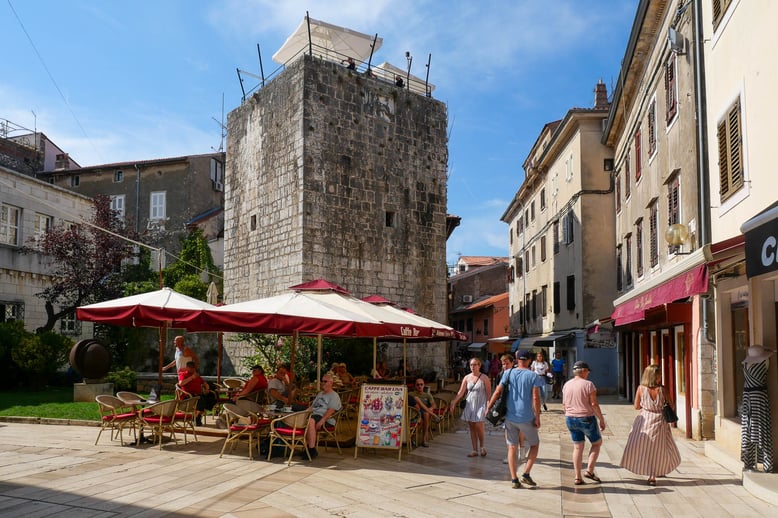 La vieille ville abrite deux anciennes tours vénitiennes du XVe siècle, l’une ronde reconvertie en bar et l’une pentagonale qui fait maintenant office de restaurant panoramique. Évidemment aucune des deux ne se visitent à part si vous souhaitez aller manger ou boire un verre. Je trouve dommage de ne pas avoir gardé tel quel ces vestiges du passés. Porec est exclusivement tournée vers le tourisme et l’on trouve des bars, restaurants et terrasses un peu partout.