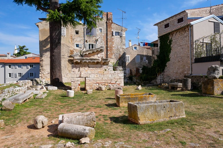 Tout à l’ouest de la péninsule de Porec se trouve les ruines d’un temple romain du Ier siècle dédié au dieu de la mer Neptune. Je préfère vous prévenir, vous pouvez passer à côté sans vous en apercevoir car disons le, il ne reste plus grand chose de ce temple. Difficile de s’imaginer à quoi cela pouvait ressembler avec les quelques morceaux dispersés à même le sol, entre reste de colonnade et sarcophage.