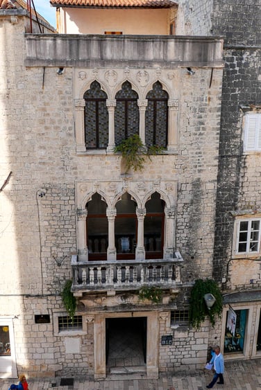 Avant de quitter la place centrale jeter un coup d’œil à la façade du palais de Cipiko, une demeure du XVe siècle à l’architecture romane qui appartenait à une famille importante. Les rues de Trogir étant assez étroites on ne s’aperçoit pas forcément des riches détails et sculptures des façades de la ville. C’est souvent en prenant du recul ou de la hauteur que l’on a une meilleure vision (comme depuis le clocher de la cathédrale). Il est possible de rentrer dans le hall du palais où l’on voit quelques sculptures et un plafonds en bois, mais le bâtiment ne se visite pas.