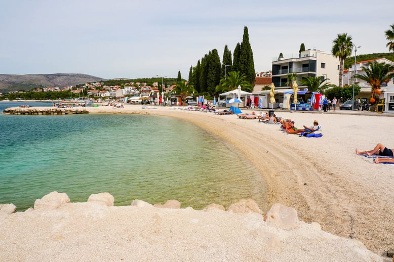 C’est la plage la plus proche de la vieille ville de Trogir, elle se situe 800 m à l’ouest (10 min à pied). Relativement petite par rapport aux précédentes, elle est également composée de gravillons (les plages de sable sont très rares en Croatie). Il y a deux bars au bord de la plage pour se rafraichir ainsi que des transats à la location. Si vous souhaitez venir en voiture il y a un parking payant sur place.