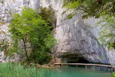 Au bout d’un moment vous allez arriver sur un lac où une bifurcation part vers la droite. La passerelle en bois mène à une grotte qui permet de monter en haut du canyon (pour un super point de vue). Vous pouvez y monter mais il faut absolument redescendre pour suivre le circuit H (direction « Big waterfall ») sans quoi vous manquerez tout simplement la plus haute cascade du parc national de Plitvice. Vous passerez de toute façon sur le retour par ce point de vue en haut du canyon. La grotte en elle-même n’a aucun intérêt et vous éviterez comme ça les 80 m de dénivelé des escaliers. Je sais de quoi je parle je me suis fait avoir à faire l’aller retour