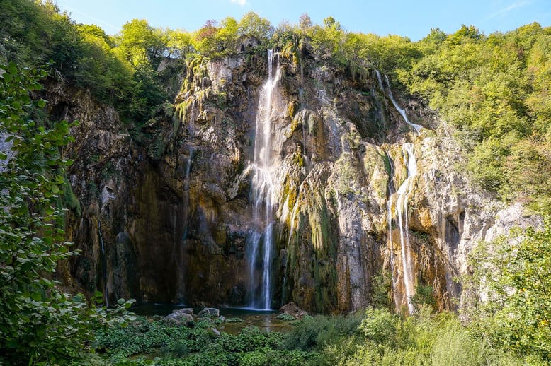 Au bout des passerelles à proximité de l’entrée n°1 du parc on arrive à la plus grande cascade de Croatie (Veliki Slap). Elle mesure 87 m au total (67 m pour la chute principale) et son débit varie de 4 000 L/s à 80 L/s suivant les saisons. Au mois de septembre il n’y avait pas énormément d’eau et pour vous dire la vérité j’ai été un peu déçu par la cascade, je m’attendais à quelque chose de plus grandiose. Si vous souhaitez voir beaucoup d’eau dans les cascades du parc il faut venir au mois de juin ou au début de l’été.