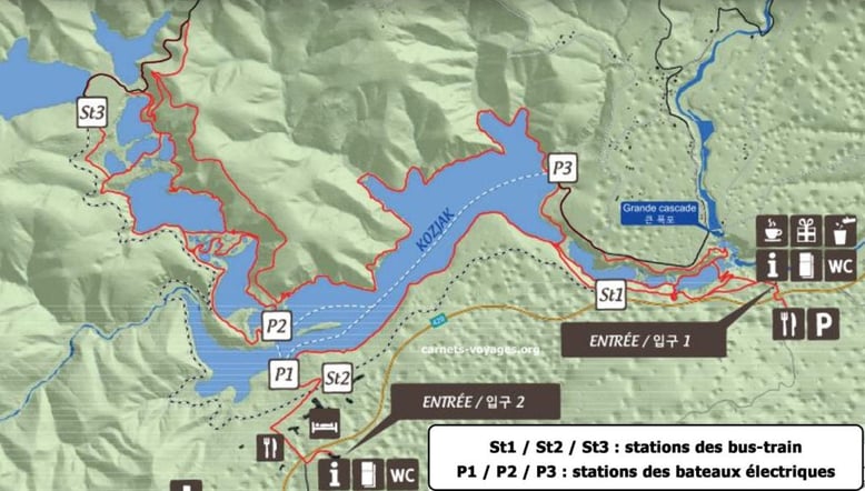 Le parcours K qui emprunte la totalité des sentiers fait 18,3 km pour un temps de marche de 6-8h. Il peut se faire depuis l’entrée 1 ou 2. A moins d’être super fan de randonnée je vous déconseille le parcours K. L’itinéraire est vraiment long et le trajet entre les stations P2 et P3, qui peut se faire en bateau électrique, n’apporte rien de plus. Vous marchez uniquement dans la forêt le long de la rive du lac Kozjak, il n’y a pas de cascade.