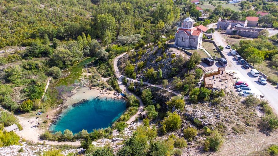 Une fois arrivé sur place, il y a quelques places de parking devant une plateforme en bois nouvellement construite. C’est à partir d’ici que vous aurez le meilleur point de vue pour observer l’œil de Cetina, même si cela ne rend pas aussi bien qu’avec un drone. Juste à côté de la source se trouve une jolie église orthodoxe serbe.