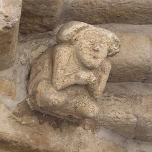 A l’abri du porche… la façade est épaulée de contreforts et s’ouvre sur un porche. Le portail a été remanié au XVIè siècle. Son clocher, robuste et carré, est accolé à la façade. Inspiré de l’art roman, il est percé de deux colonnettes médianes. Observez les contreforts à glacis qui remontent jusqu’au toit.