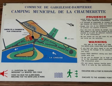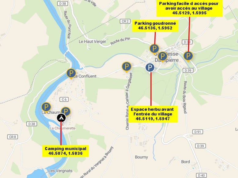 Camping municipal de la Chaumerette, super sympa, au bord de la Creuse. Electricité Eau assainissement, Petite auberge à proximité. Pas d'évacuation des eaux grises.