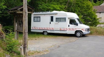 Simple arrêt en bord de route et en pente. Joli village. Stationnement très compliqué pour les camping-car.
